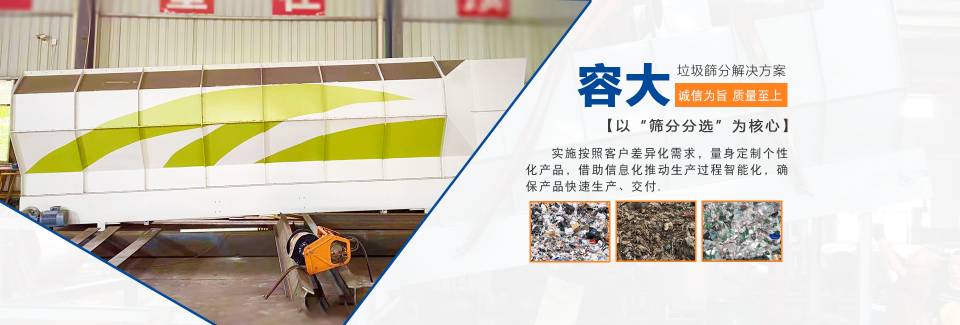 泉州容大機械有限公司是一家專研生活垃圾分選的企業,以“篩分分選”為核心,實施按照客戶差異化需求,量身定制個性化產品,柔性化生產管理模式,以智能制造為主攻方向,以客戶需求為中心,借助信息化推動生產過程智能化,確保產品快速生產、交付。生活垃圾處理領域內的技術研究,利用篩分、分選技術的核心競爭力,圍繞“智能、高效、節能、環?!卑藗€大字為中心,為循環經濟項下的各種生活垃圾處理項目提供成套的技術解決方案 ...